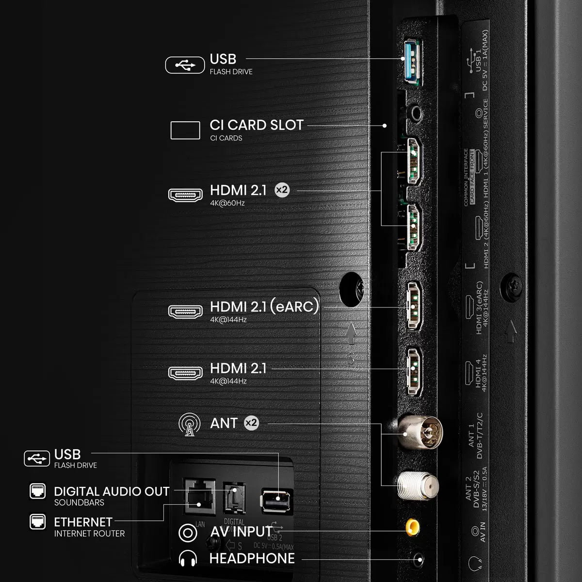 Powered by VIDAA OS, access all your favourite apps—Netflix, Disney+, Prime Video, YouTube—and enjoy seamless connectivity with Dual Band WiFi, HDMI 2.1, AirPlay, Bluetooth, Share to TV, and WISA-ready.