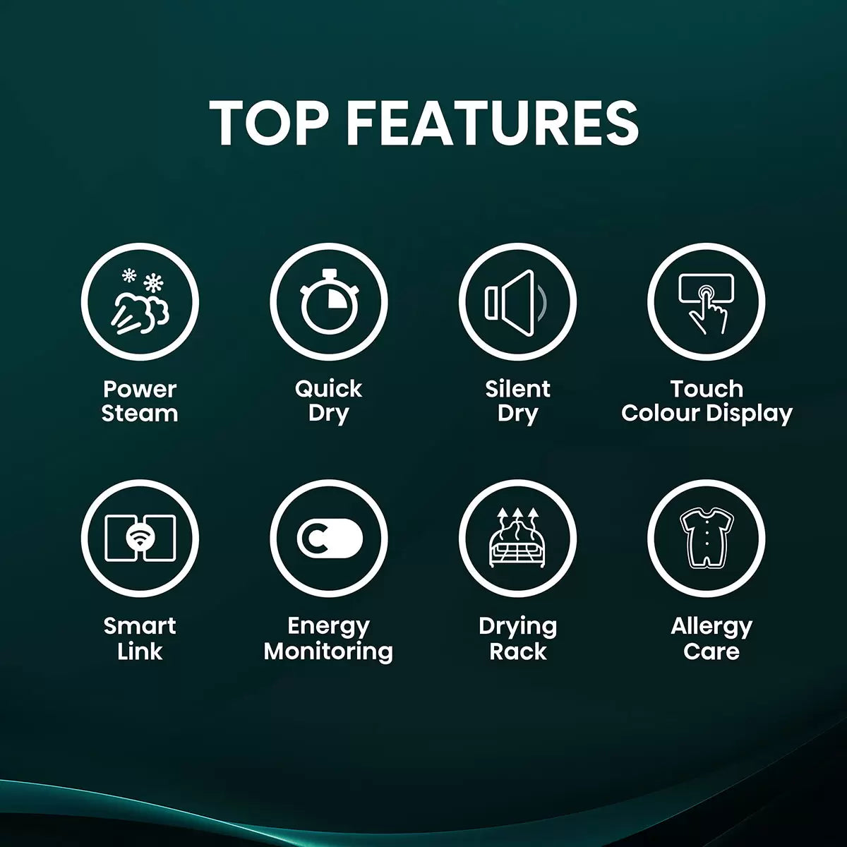 Power Steam: Steam is released before drying starts to soften fabrics, reduce wrinkles and neutralise odours. Finish cycles with crisp, ready-to-wear garments – ironing optional!