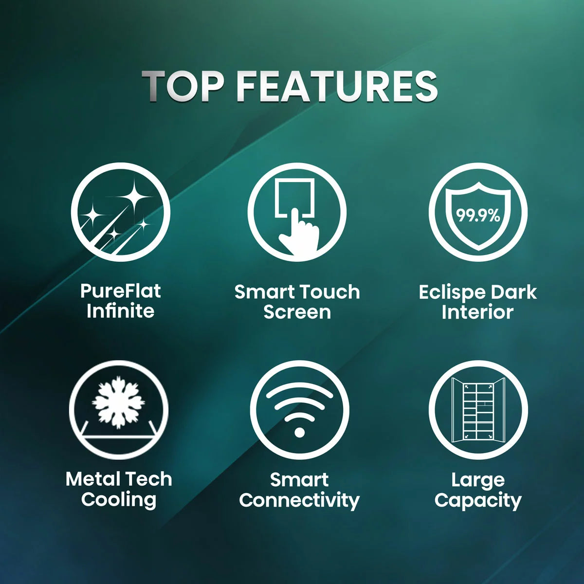 The Total No Frost system ensures even cooling and saves you from defrosting forever. With Metal-Tech Cooling and a powerful yet quiet Inverter Compressor, temperatures stay consistent throughout while energy usage stays low.