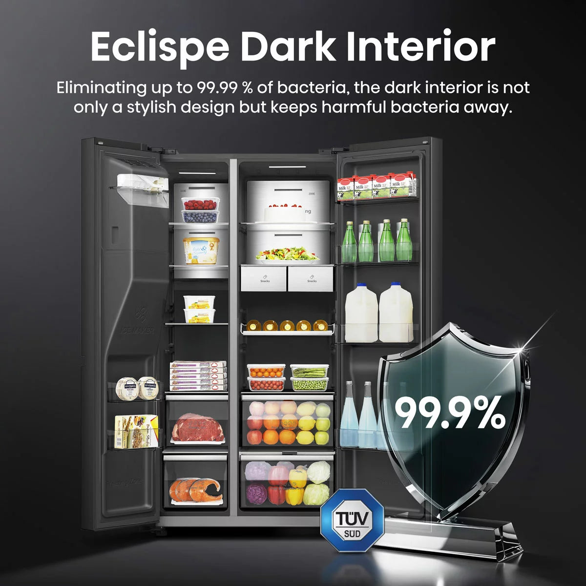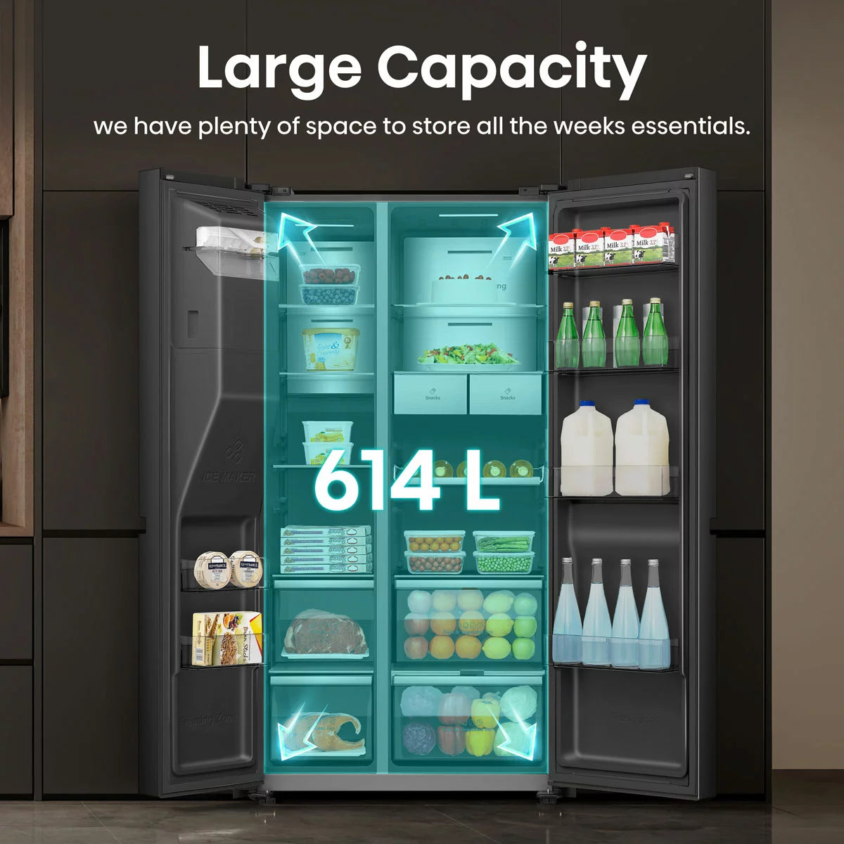 Inside, the premium dark interior not only looks stunning but also features an anti-bacterial liner that eliminates 99.9% of bacteria, keeping food fresher and healthier for longer. The huge 614L capacity (around 35 bags of shopping) offers flexible storage for families and entertainers alike, while XXL door balconies mean bulky bottles and cartons finally have a proper home.