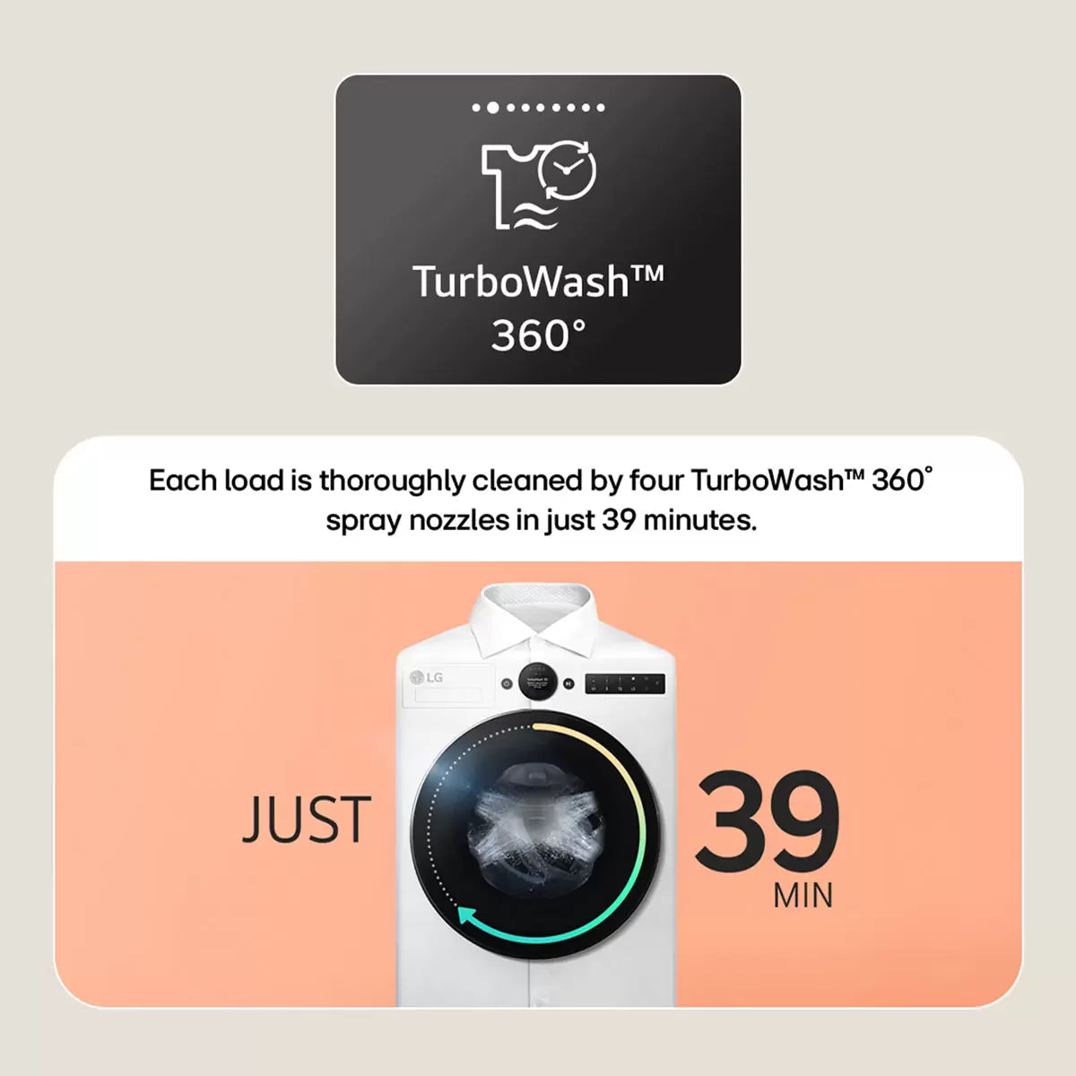 A powerful wash in 39 minutesEach load is gently, thoroughly cleaned by four TurboWash™ 360˚ spray nozzles in just 39 minutes.