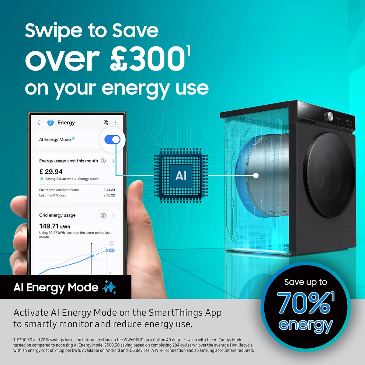 ** Based on internal testing on the WW7000D models on a Cotton 40 degrees wash with the AI Energy Mode turned on compared to not using AI Energy Mode.